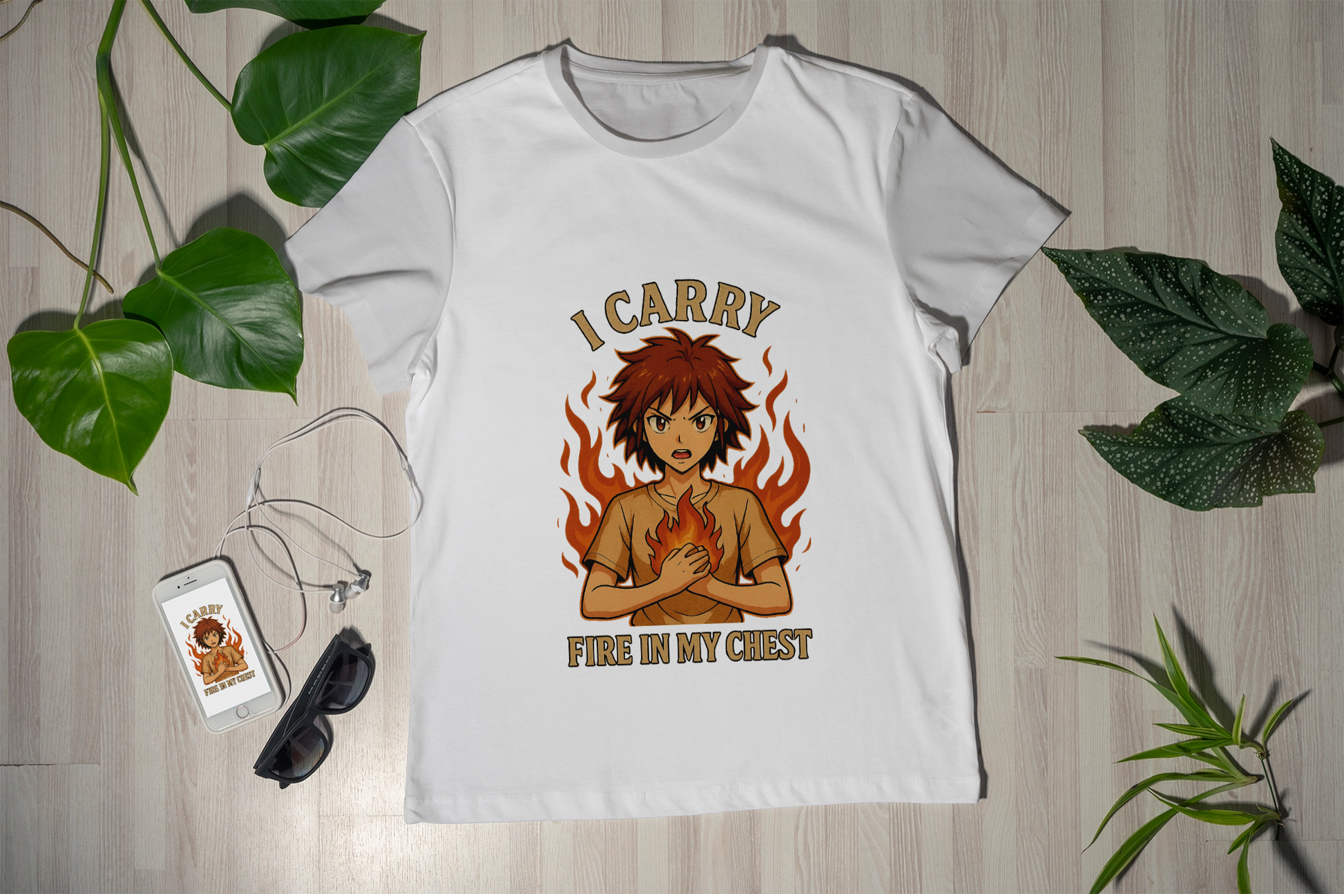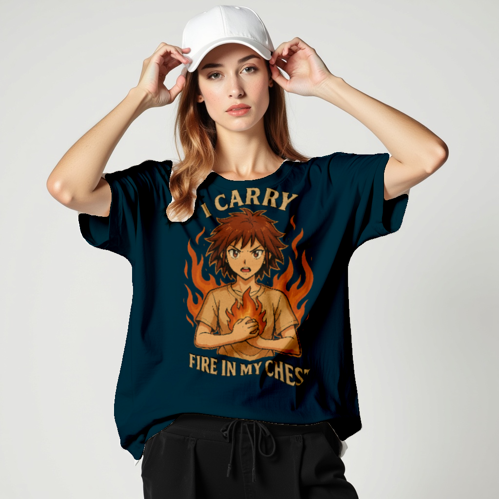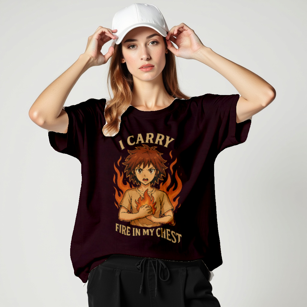 This anime-inspired tee features a bold design and empowering quote: “I Carry Fire in My Chest.” It’s perfect for those who live with passion, purpose, and fierce determination.