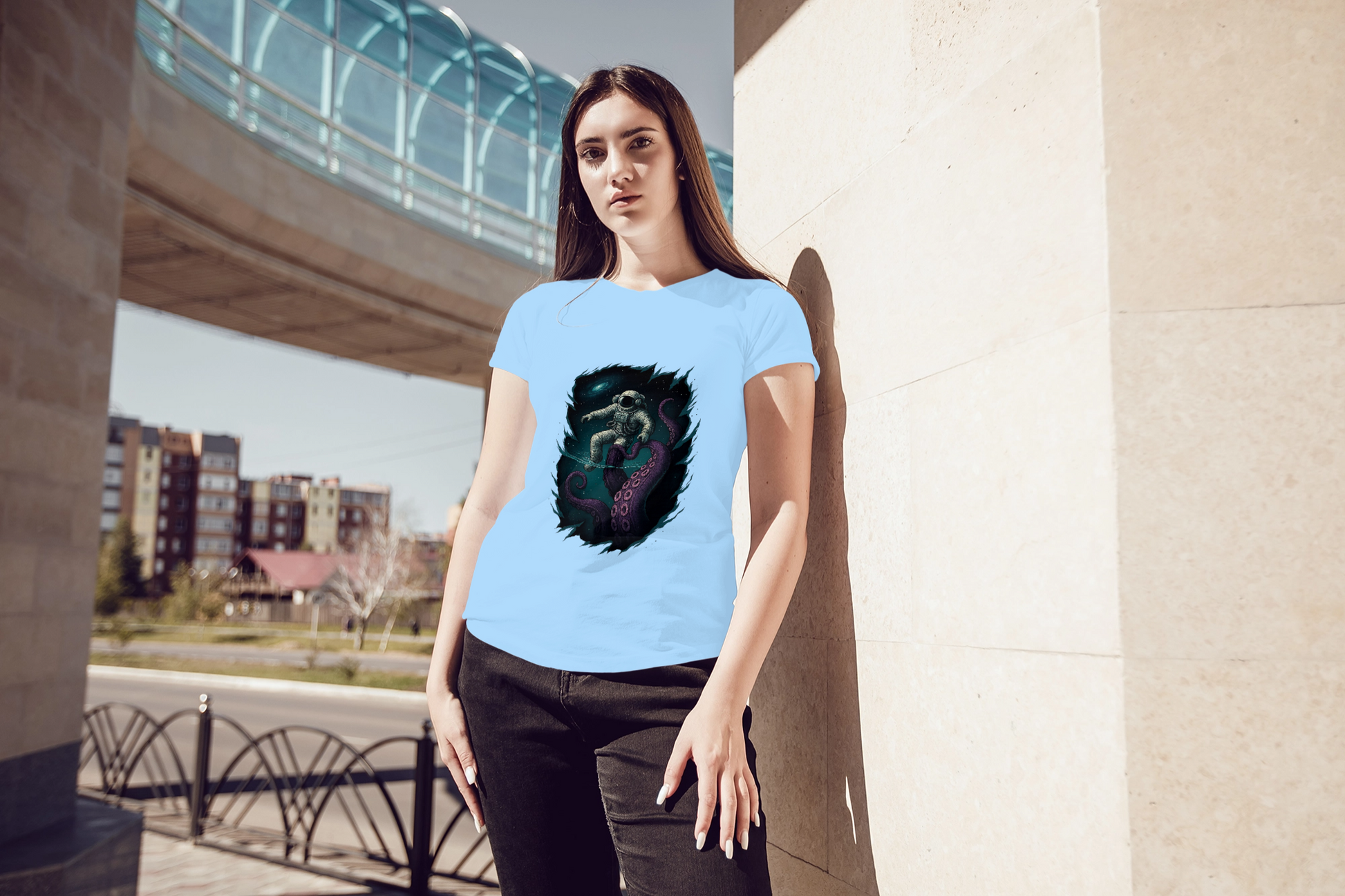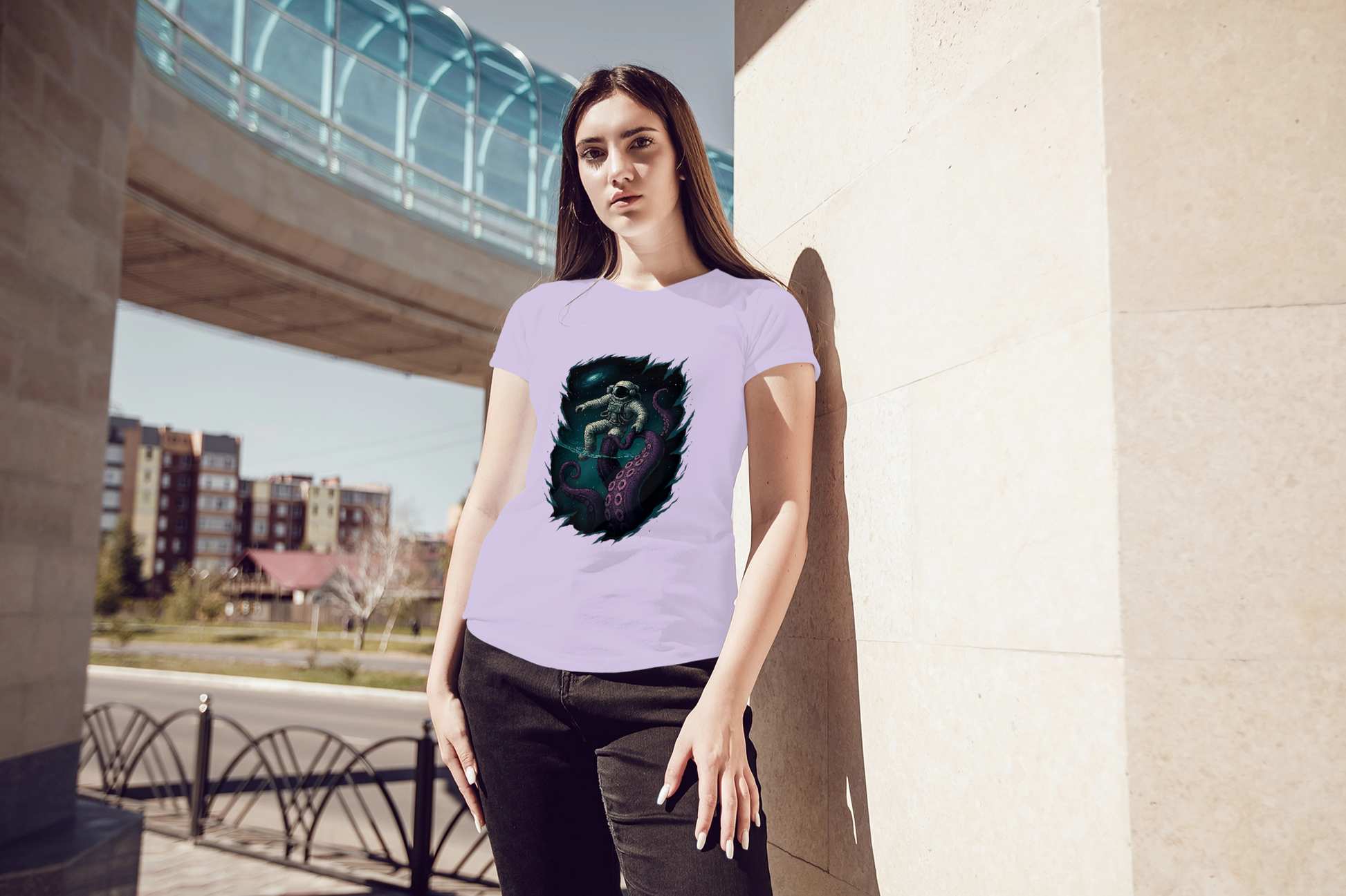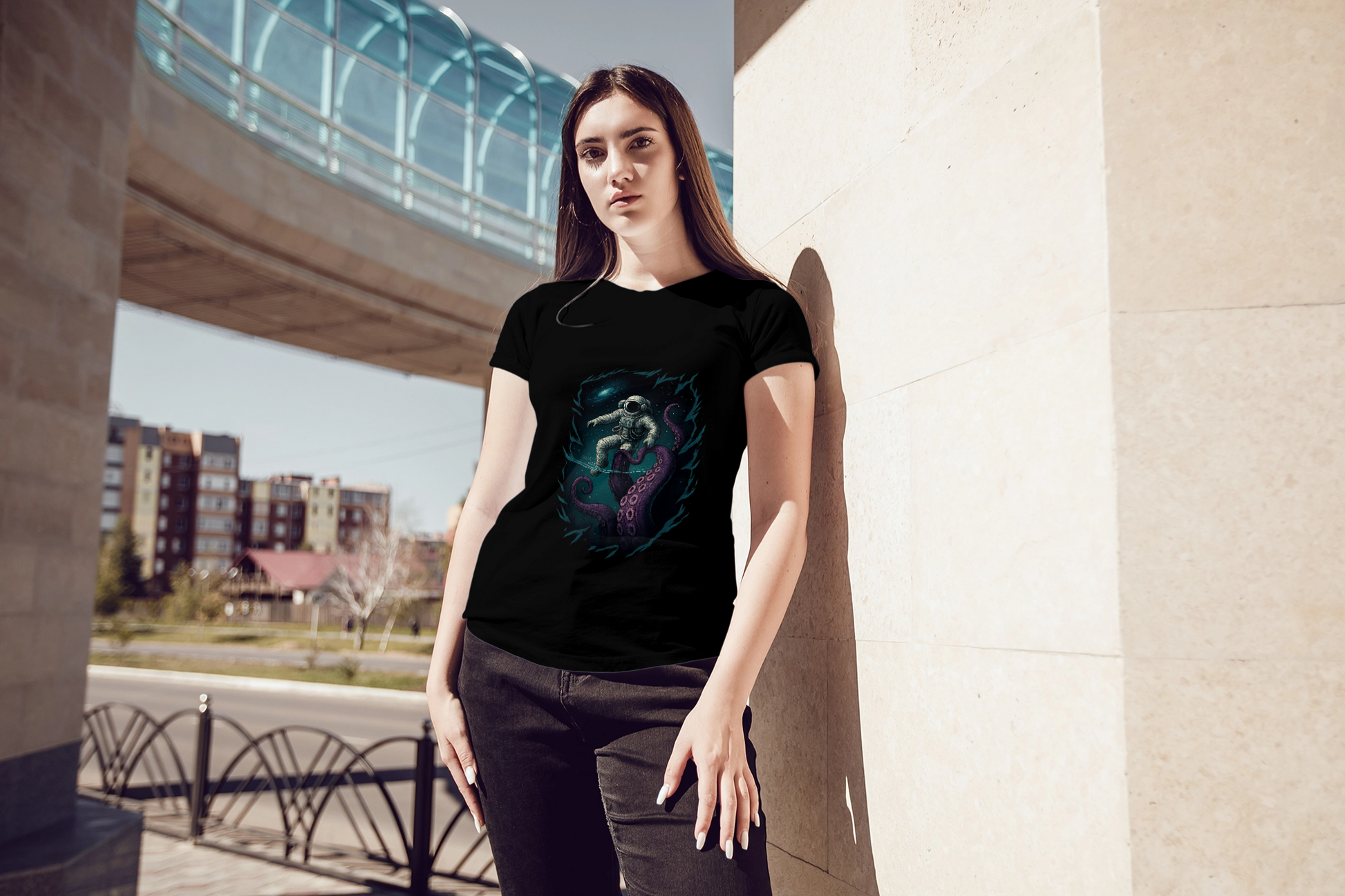 Dive into style with the Into the Abyss: Cosmic Encounter t-shirt – where space meets the deep sea in an epic graphic design.