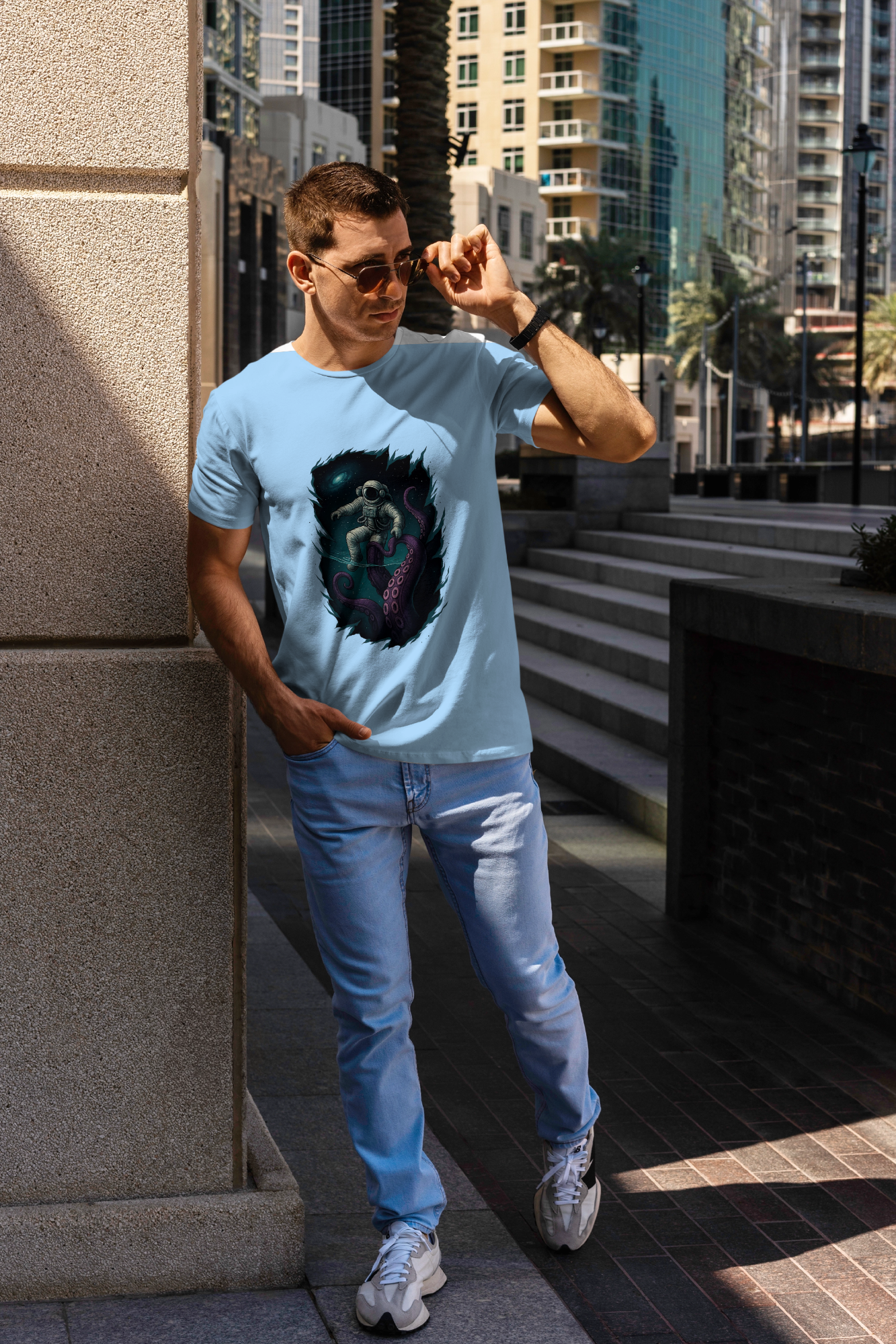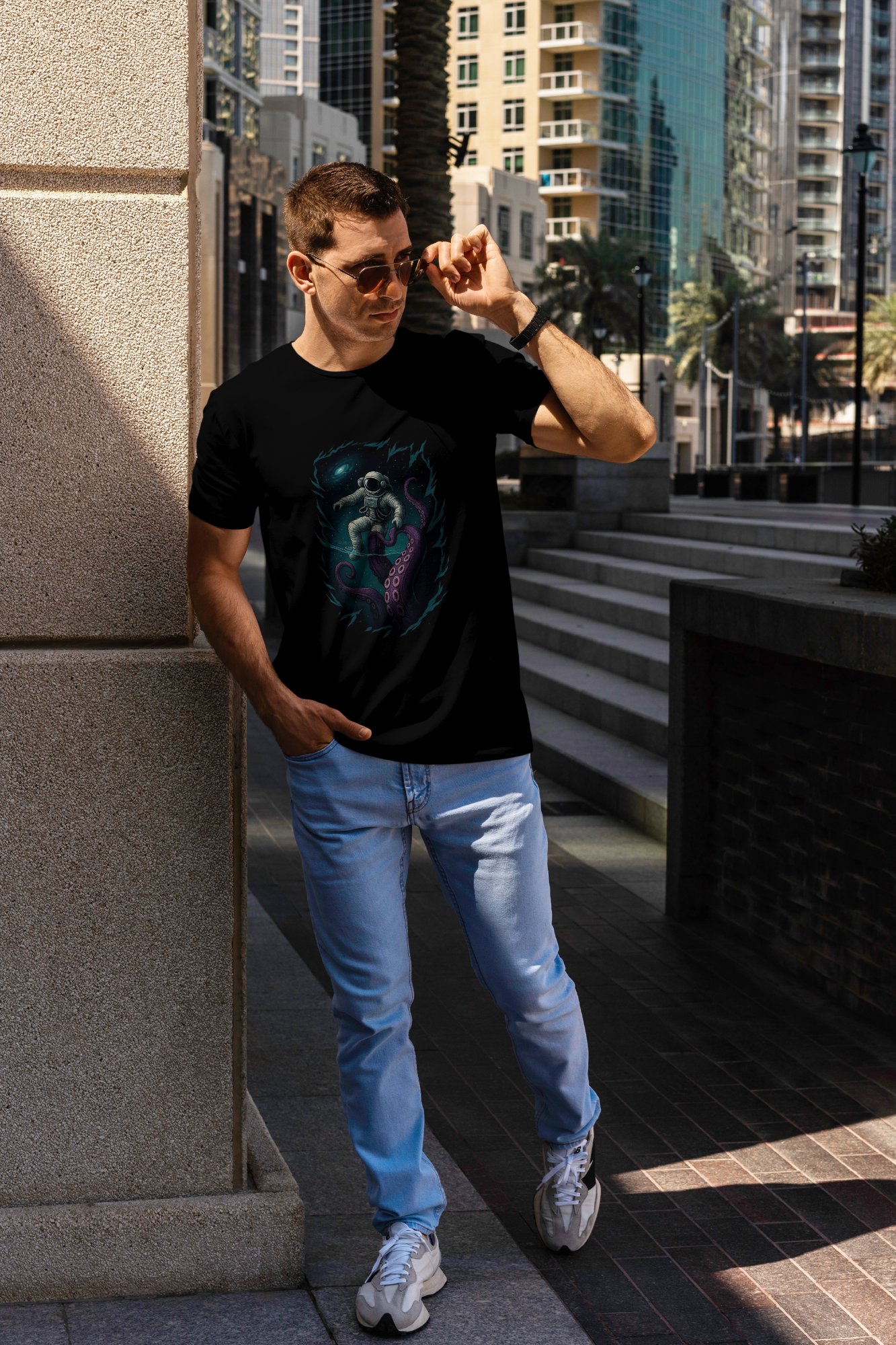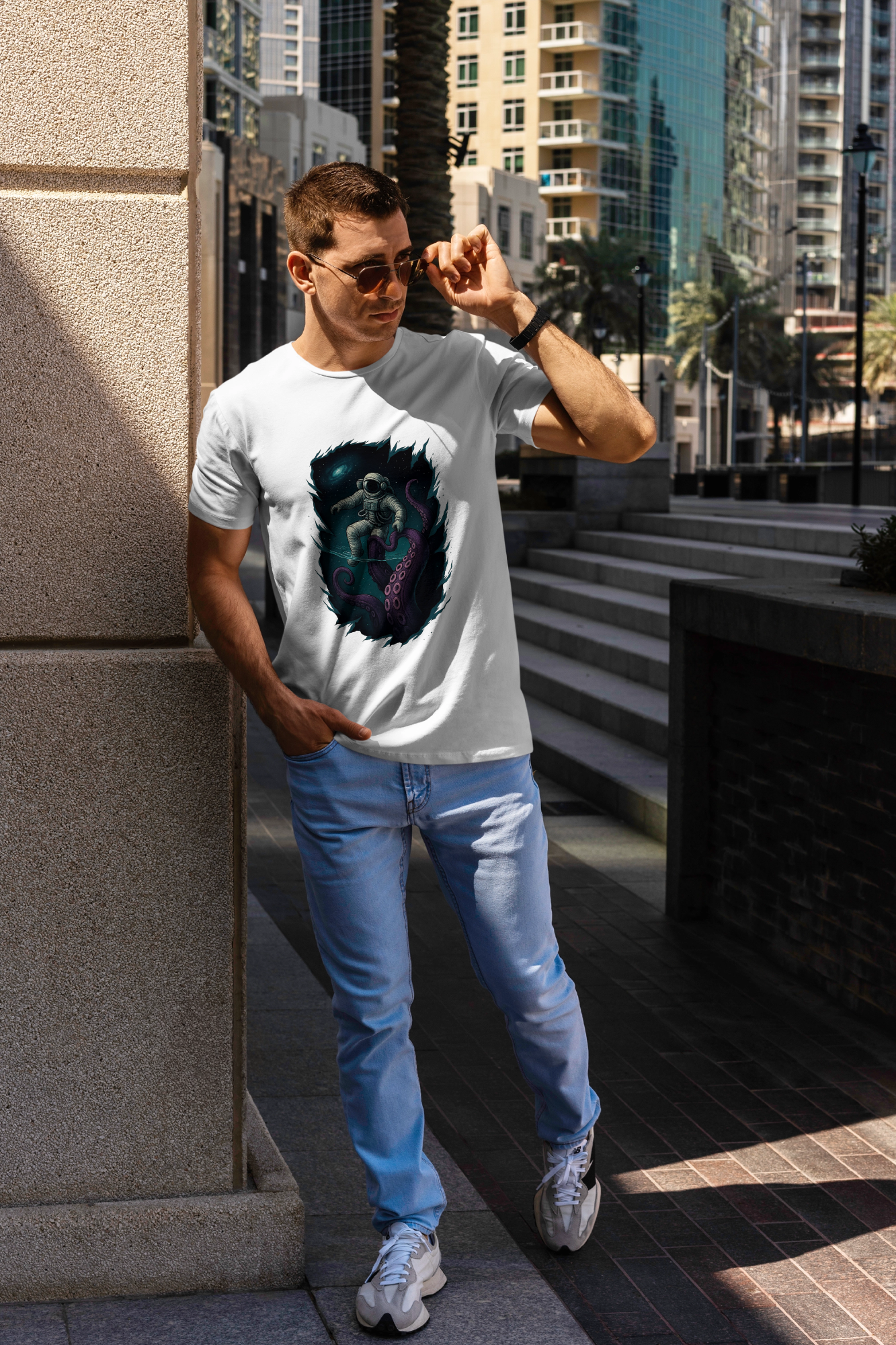 Dive into style with the Into the Abyss: Cosmic Encounter t-shirt – where space meets the deep sea in an epic graphic design.